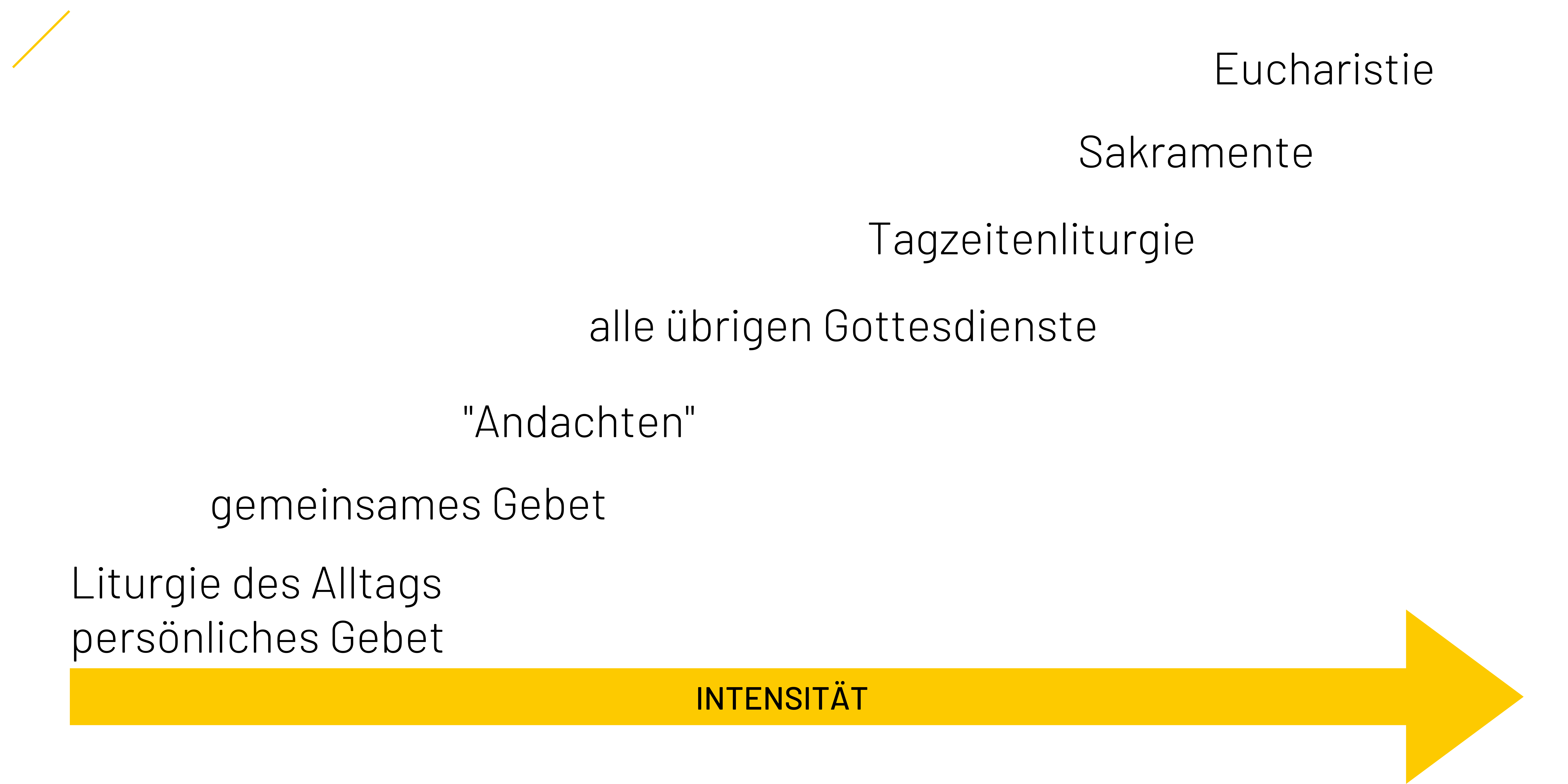 Hinsichtlich der Form ergibt sich eine Skalierung von Liturgie, an deren obersten Ende („Quelle und Höhepunkt“, Lumen Gentium, 11) die Eucharistiefeier als Gedächtnisfeier unseres Gründungsauftrages steht. Andererseits ist auch ein Leben des Alltags eingedenk des Erlösungsgeschehens (Pascha-Mysterium), der Gegenwart Christi und in Verbundenheit mit der kirchlichen Gemeinschaft aller Getauften Gottesdienst.