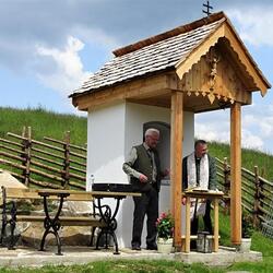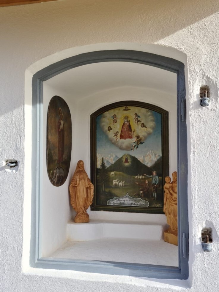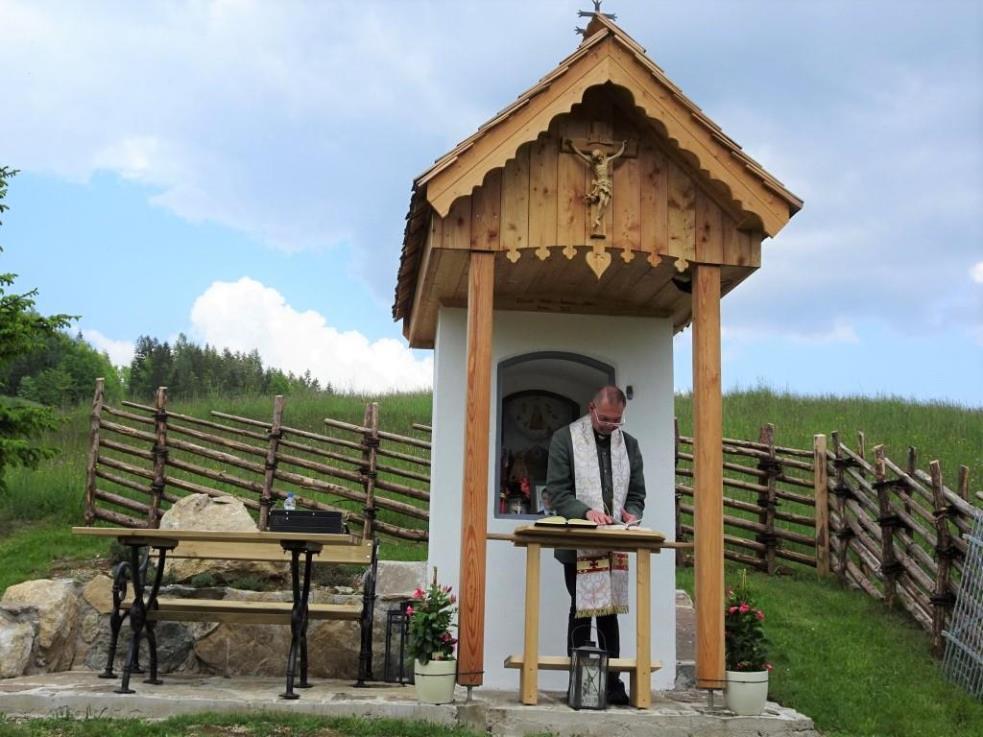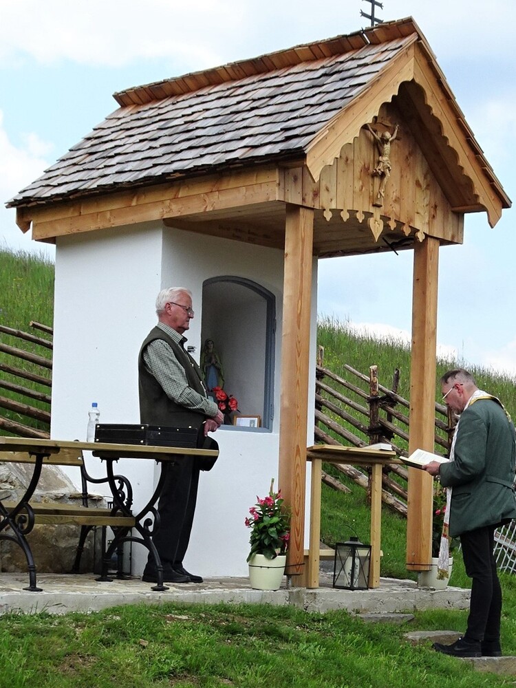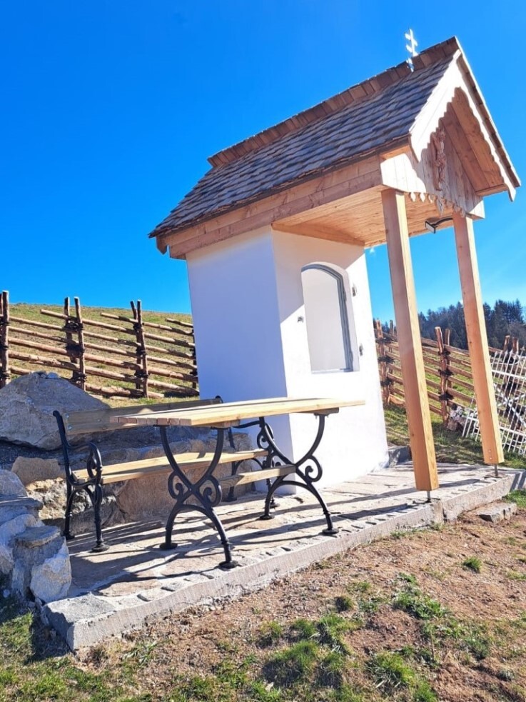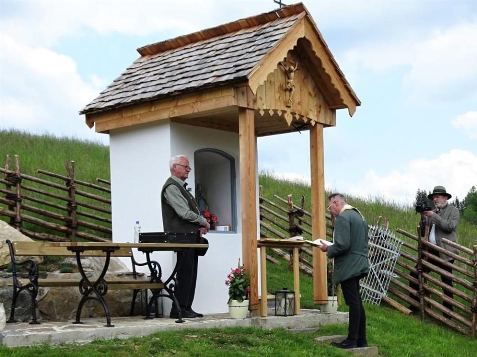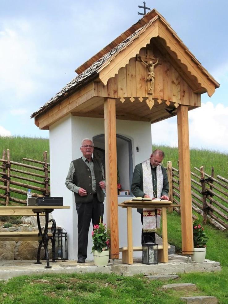 Das morsche Holzvordach wurde durch eine gefällige Lärchenholzstruktur ersetzt. Das Dach wurde mit neuen Holzschindeln gedeckt und das Wetterkreuz wiederum am First befestigt. Ein einzigartiges Novum ist die Installierung einer Solarbeleuchtung für die Nacht.