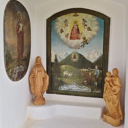 In der zentralen Mauernische befindet sich neben dem Gnadenbild Maria Luschariberg, flankiert von wertvollen Maria- und Jesus-Statuen, neuerdings auch zwei Heiligenstatuen aus Lindenholz, hergestellt vom