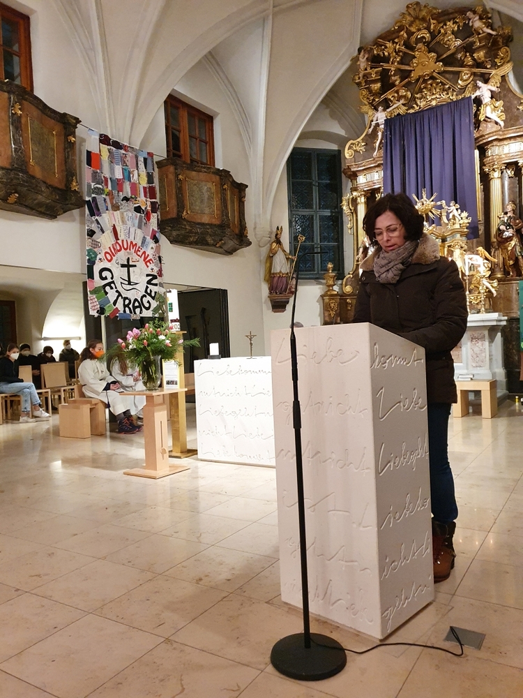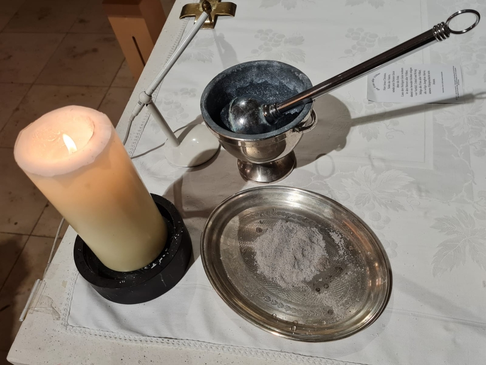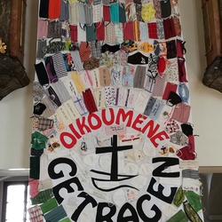 Wir sind von Gott getragen - in der Pandemie und anderen Nöten des Lebens! Diese zentrale Botschaft des ökumenischen Getragen-Tuches, das bis Mitte März in unserer Kirche zu betrachten ist, wurde beim Aschermittwoch-Gottesdienst von Vikar Gerhard Hatzmann und Birgit Zepf sehr schön erläutert. Getragen-Tuch und Aschenkreuz – zwei starke Symbole zu Beginn der Fastenzeit!