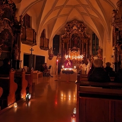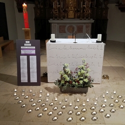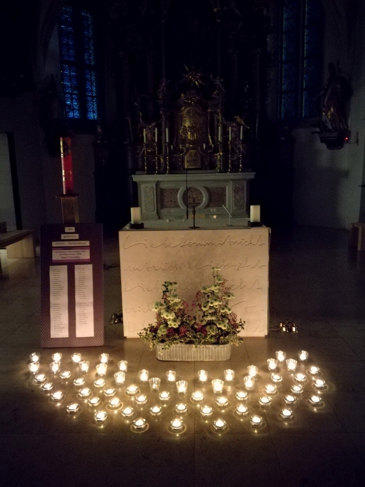 Beim Allerseelengottesdienst gedachten wir all unserer Verstorbenen. Für die im letzten Jahr Verstorbenen unserer Pfarre, deren Namen nochmals vorgelesen wurden,  brannten 59 Teelichter. Die 60. Kerze wurde für alle ungenannten Verstorbenen entzündet. Das „Lichtermeer“ vor dem Altar verweist hoffnungsvoll auf das Licht der Auferstehung für unsere lieben Verstorbenen!