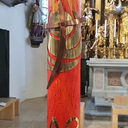Diese Botschaft symbolisiert - über die österliche Auferstehungsfeier hinaus - die wunderschöne Osterkerze, gestaltet von Maria und Martin Kirchberger.