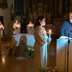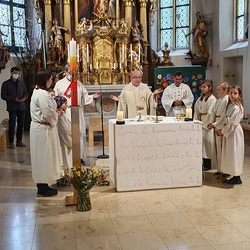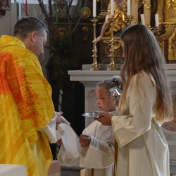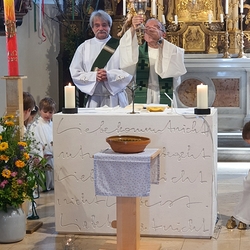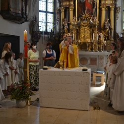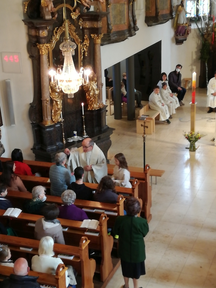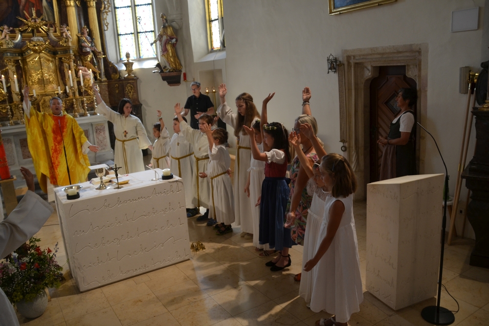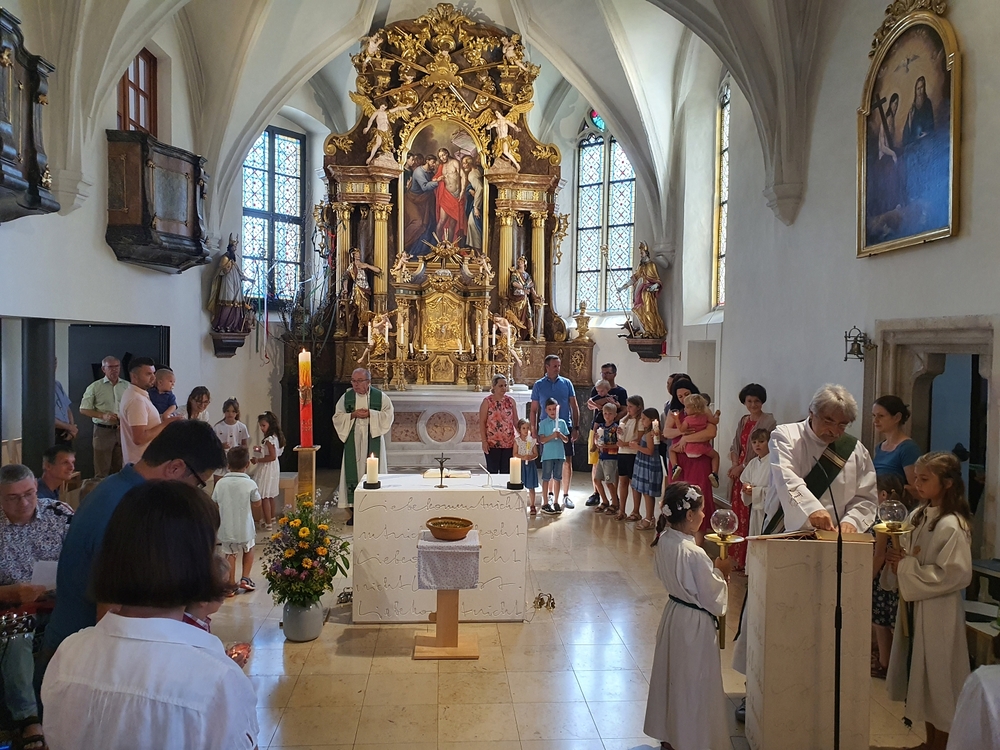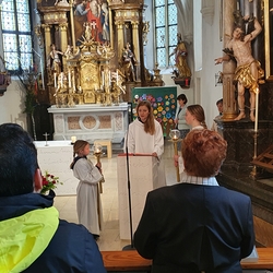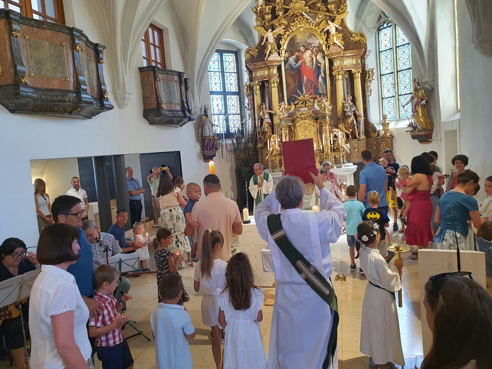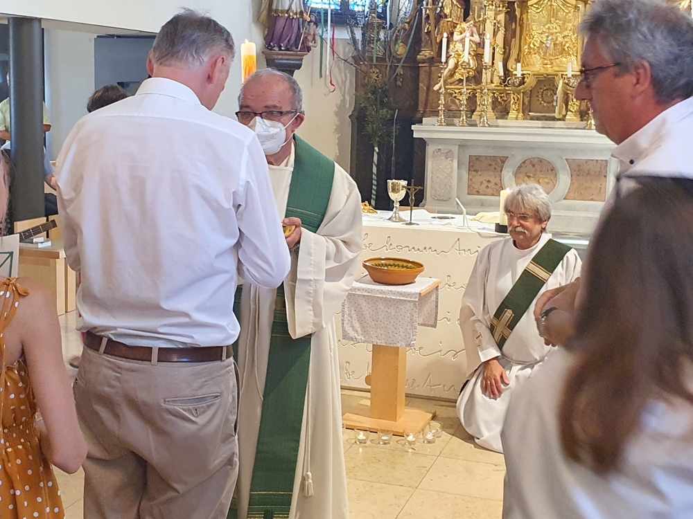 Am Sonntag den 26. Juni haben wir mit den Täuflingen der Corona Zeit einen Familiengottesdienst gefeiert. Die anwesenden Kinder wurden mit frisch gesegnetem Wasser während der Kommunionausteilung zur Erinnerung an ihre Taufe gesegnet. Die beiden Taufbewerber Mehri und Ali aus dem Iran wurden bei diesem Gottesdienst vorgestellt und mit dem Katechumenenöl gesalbt.