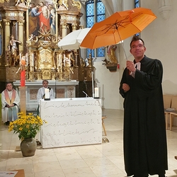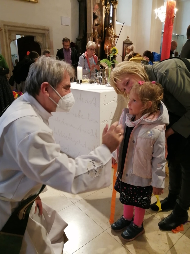 Mit dem Begrüßungssatz „Heute gießt der liebe Gott die Blumen!“, zauberte Vikar Gerhard Hatzmann – in Anspielung auf das Regenwetter – allen großen und kleinen Menschen in unserer Pfarrkirche ganz schnell ein Lächeln ins Gesicht. Eine wunderbare, fröhliche Erntedankfeier folgte.