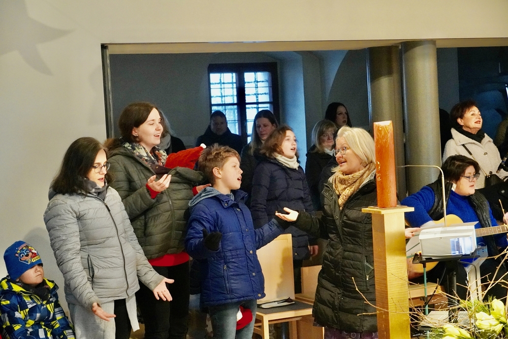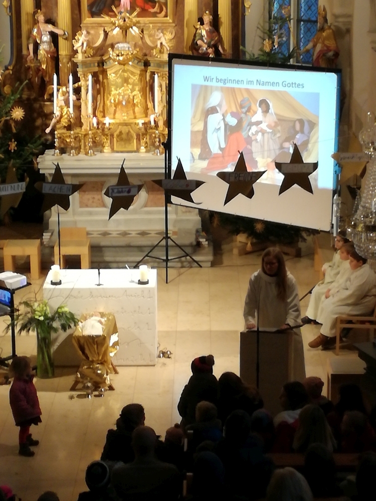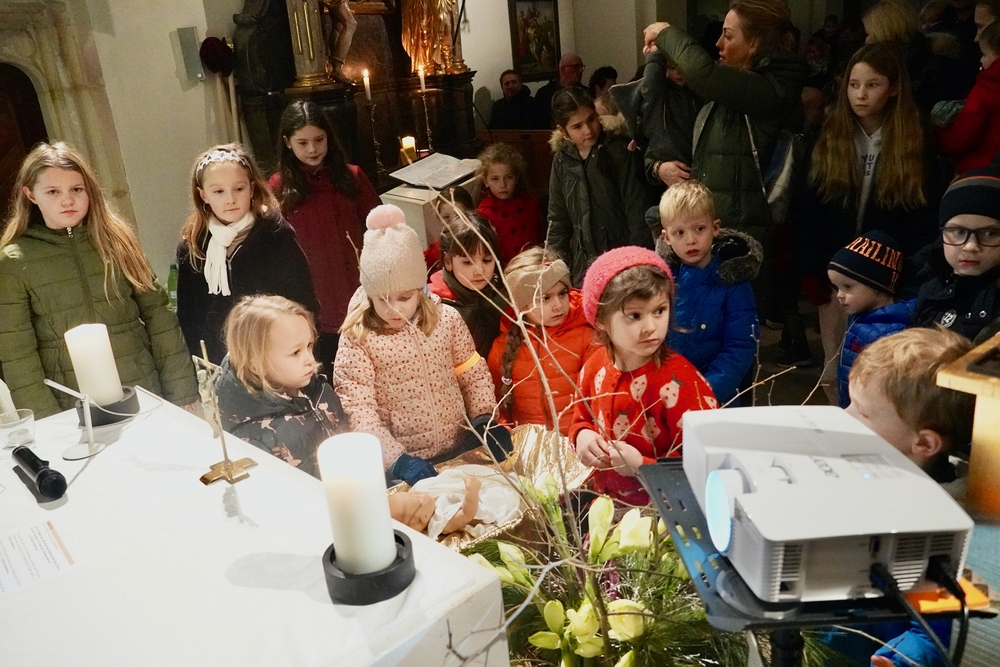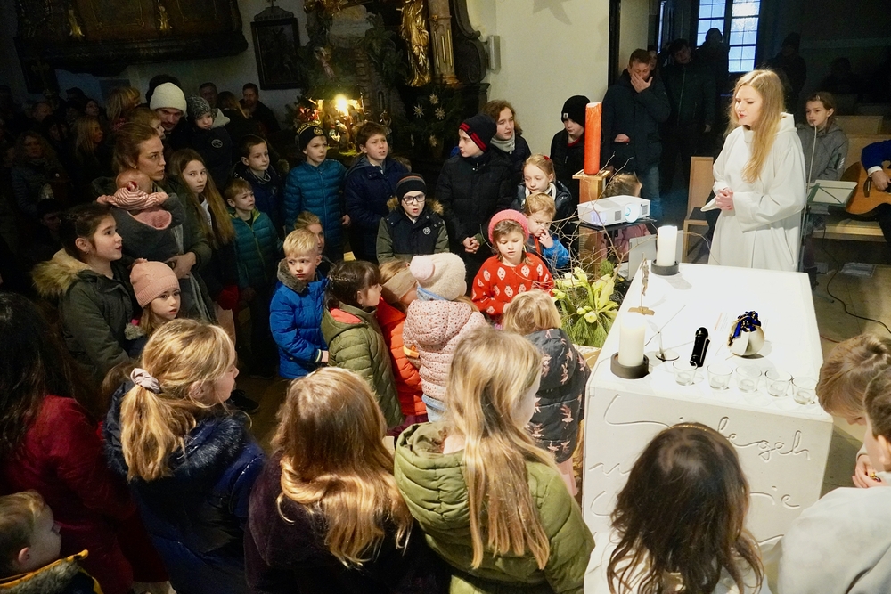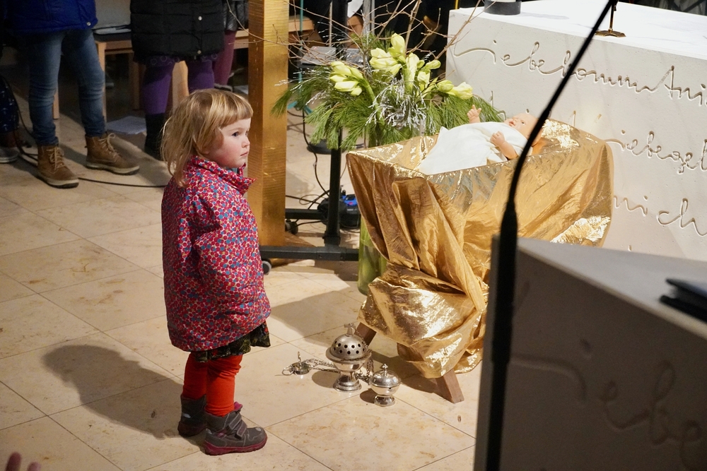 Mit vielen Kindern, Eltern und Großeltern feierte Wort-Gottes-Feier-Leiterin Anja Asel am Nachmittag des Heiligen Abends in unserer weihnachtlich geschmückten Kirche die Geburt des Jesuskindes. Die Feier wurde von unserer „Kirchenband“ mit wunderbaren Weihnachtsliedern musikalisch gestaltet. Begeistert sangen Groß und Klein mit und man spürte die Freude aller, am „Geburtstagsfest des Jesuskindes“ teilzunehmen.