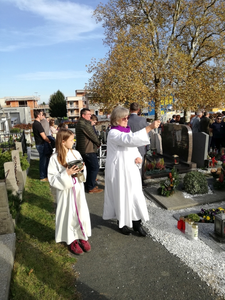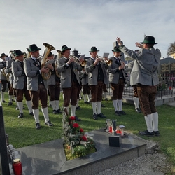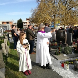Bei strahlendem Herbstwetter nahmen zu Allerheiligen viele Menschen an der Feier auf unserem Friedhof teil. Mit berührenden Texten vermittelten Christa und Diakon Franz Habith den FriedhofbesucherInnen die zentrale Hoffnung unseres christlichen Glaubens, dass unsere lieben Verstorbenen neues Leben bei Gott erwarten dürfen. Die Namen der im letzten Jahr Verstorbenen wurden vorgelesen. Musikalisch wurde die Feier von der MUZ festlich umrahmt. Nach der Gräbersegnung boten unsere Minis ihre selbst gebackenen Allerheiligenstriezerl an. Danke für die freiwilligen Spenden!