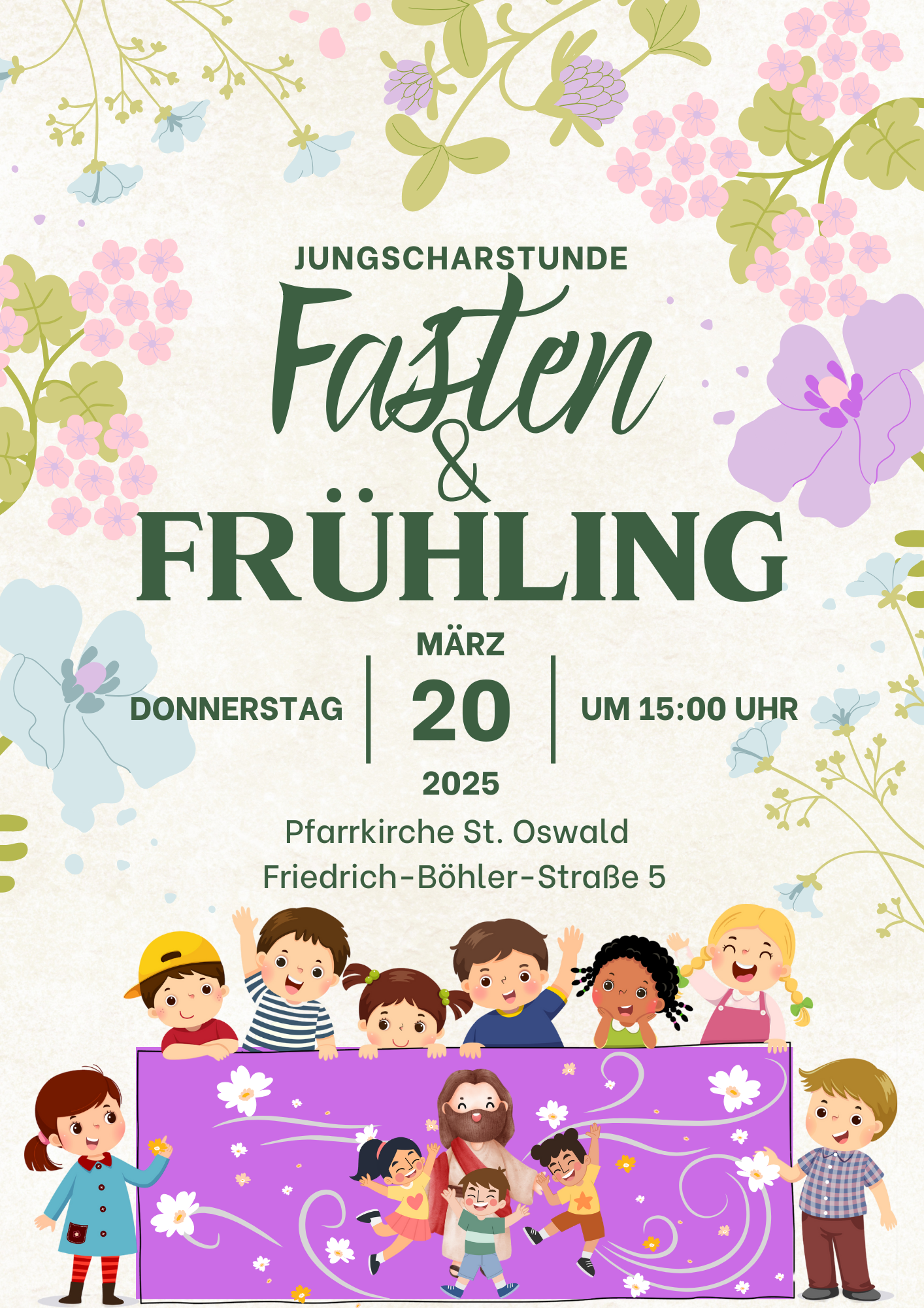 Die nächste Jungscharstunde findet statt am 20.03.2025 zum Thema: Fastenzeit & Frühling !